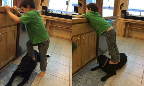 โดยเป็นภาพทริก ลูกชายวัย 6 ขวบที่มีอาการดาวน์ซินโดรม ยืนอยู่บนตัวสุนัขพันธ์ลากราดอร์สีดำตัวหนึ่ง ที่กำลังนอนอยู่หน้าอ่างล้าง เพื่อให้มีความสูงพอที่เขาจะเอื้อมมือลงไปได้ พร้อมข้อความว่า